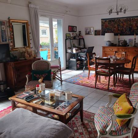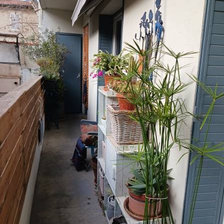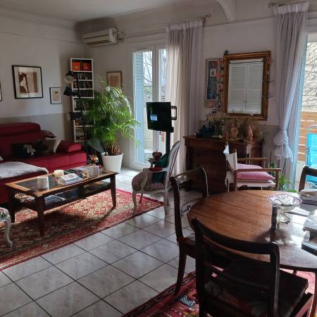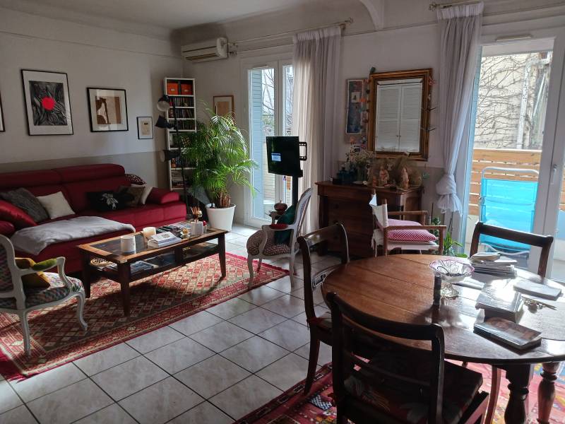 Avignon intra-muros quartier des Teinturiers, au 1er étage d'une petite copropriété sécurisée, appartement 55m² lumineux, grande pièce à vivre climatisée 31 m² et cuisine équipée ouvrant sur balcon plein sud, 1 chambre (possibilité d'en créer une 2ème), salle d'eau-wc, double vitrage, cellier au rez de chaussée. Charge 50 €/mois, TF 760 € .